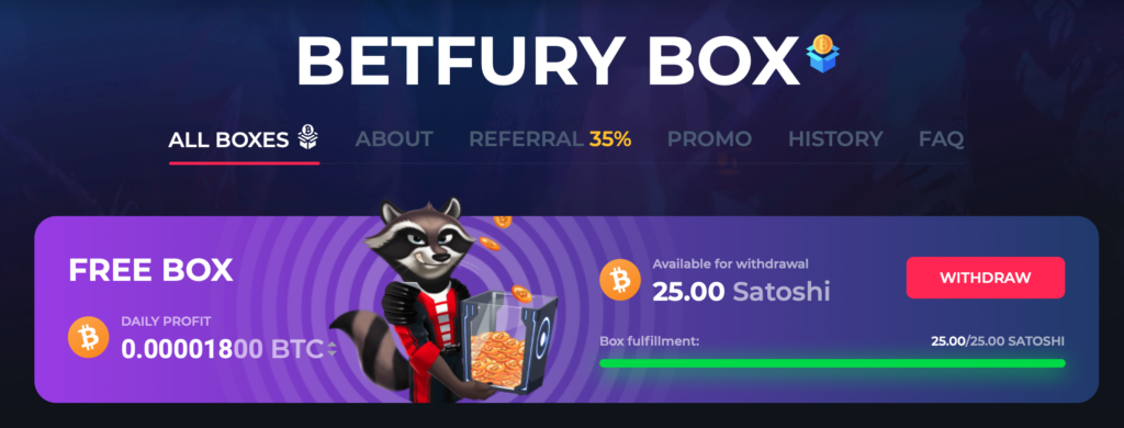 Betfury to platforma gier losowych oparta o system kryptowalutowy, która oferuje darmowe Bitcoiny (25 Satoshi co 20 minut) w swoim kraniku. Do tego mamy możliwość zarabiania w zamian za zamrożenie BTC, czy otrzymywanie tokenów BFG i TRX. Za każdy otrzymany token otrzymujemy co 24 godziny dywidendy w kryptowalutach. Platforma jest wypłacalna i warto się nią zainteresować, jeżeli posiadamy wolny czas.