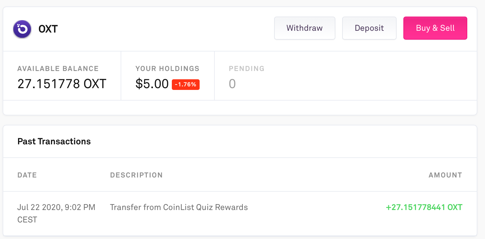 Po wykonaniu quizu otrzymamy 5$ w OXT. Wpłynie ono na konto do 4 dni. Choć ja otrzymałem w 24 godziny. Następnie OXT możemy wymienić na dolary i wypłacić.