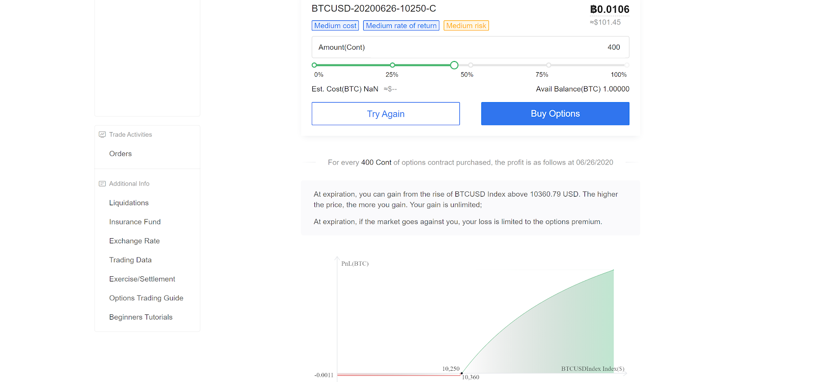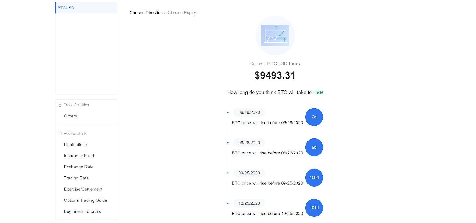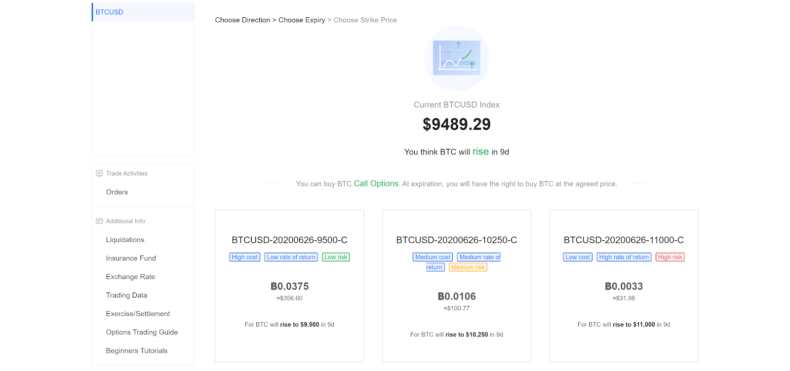 Narzędzie do wykrywania opcji pokaże różne dostępne kontrakty na opcje z różnymi poziomami kosztów i ryzyka. Dla każdej umowy zobaczysz przewidywaną cenę, którą BTC osiągnie w ciągu dziewięciu dni – nazywaną ceną wykonania.