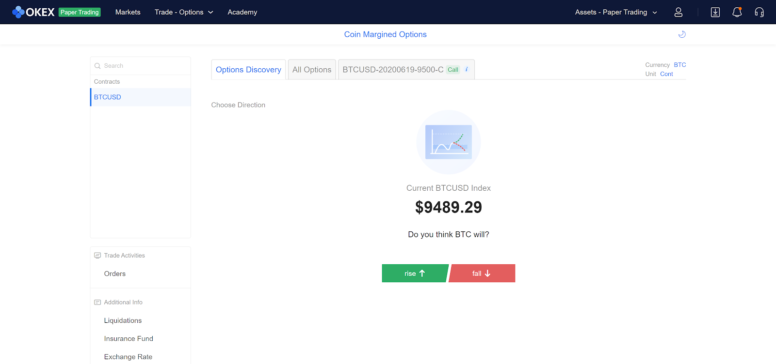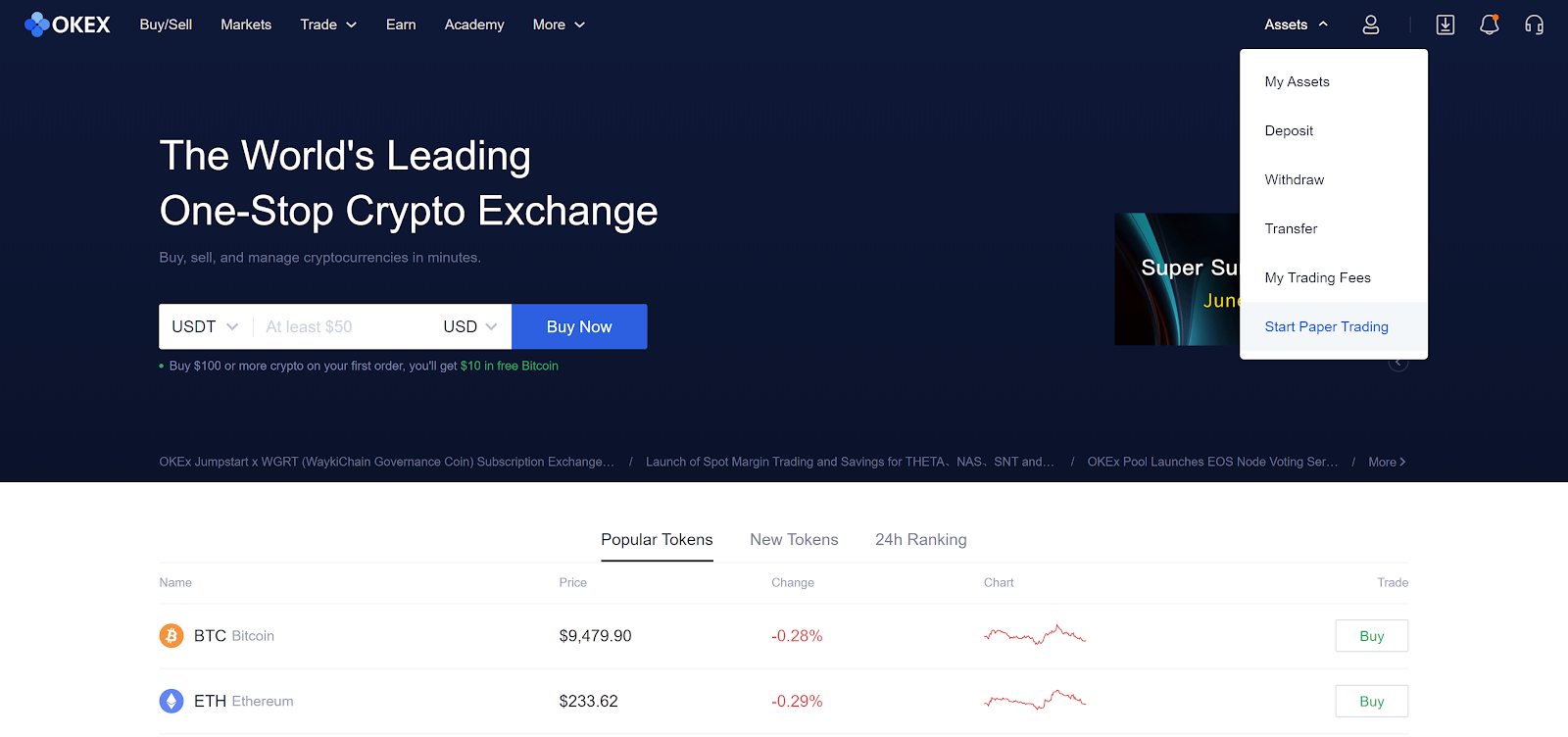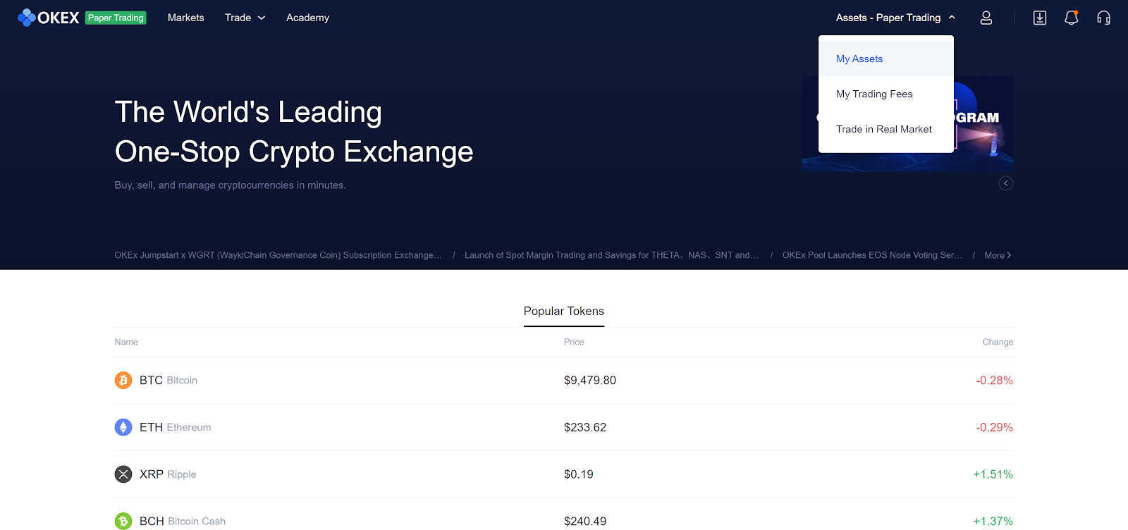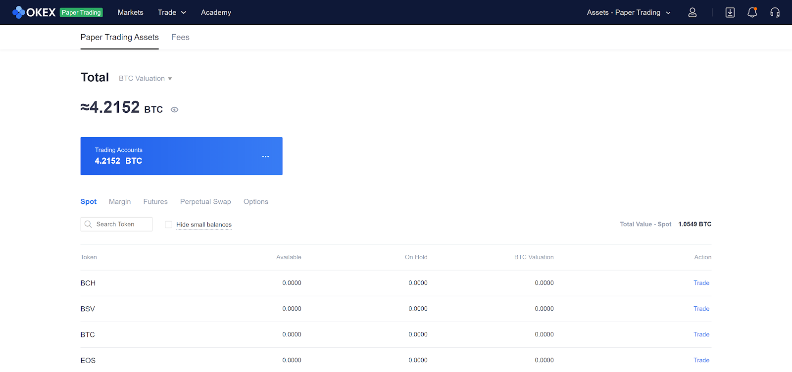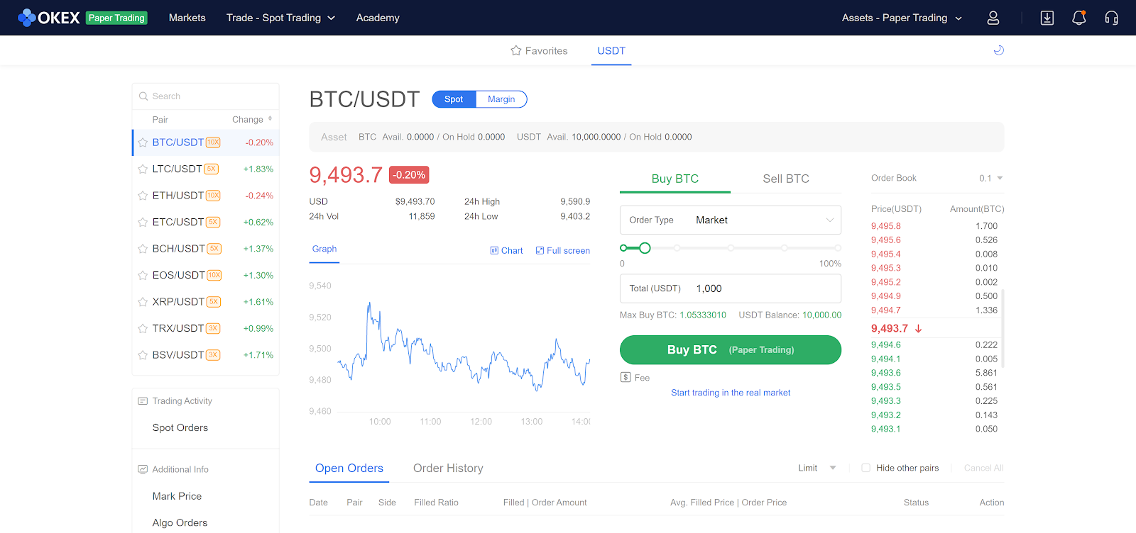 Dla użytkowników, którzy chcą nauczyć się handlować Bitcoinem (BTC) i innymi kryptowalutami bez faktycznego ryzyka utraty prawdziwych pieniędzy, handel papierami OKEx zapewnia możliwość ćwiczenia w symulowanym środowisku bez upuszczenia ani jednego satoshi.